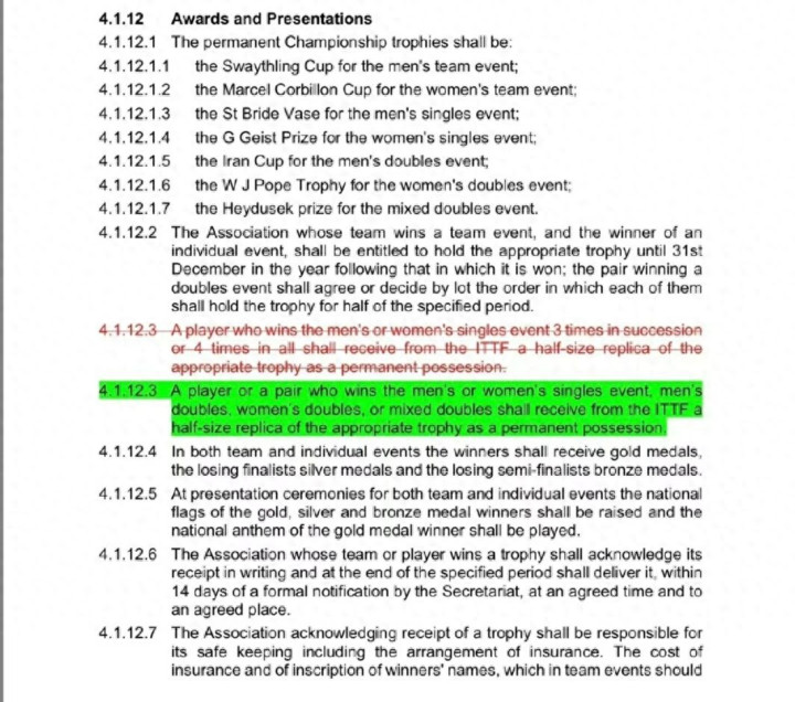 此前,国际乒联的规定是连续获得三次或者累计获得四次世乒赛男女单打冠军,将获国际乒联颁发该奖杯的半尺寸复刻奖杯作为永久收藏,并且混双、女双、男双哪怕获得连续获得三次获得累计四次冠军,也是不可能获得复制杯的。